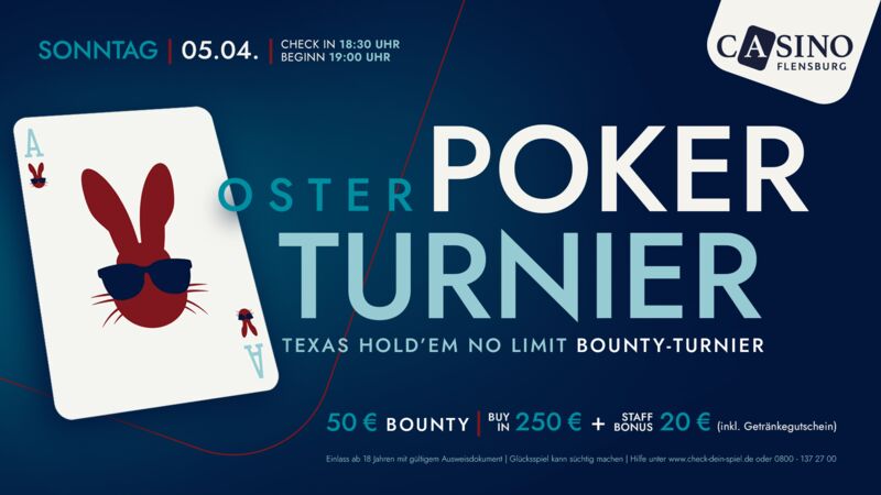 Am 05. April heißt es wieder: Karten auf den Tisch und alles auf Sieg! Beim Osterpoker können Sie das Pokerface unter Beweis stellen und um den Sieg kämpfen. Mit einem Buy-in von 250 Euro garantiert Ihnen dieses Turnier spannende Action. Seien Sie dabei und erleben Sie einen unvergesslichen Abend.